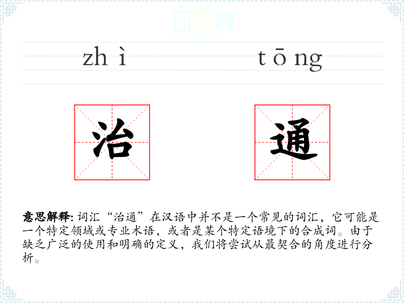 词汇“治通”在汉语中并不是一个常见的词汇,它可能是一个特定领域或专业术语,或者是某个特定语境下的合成词。由于缺乏广泛的使用和明确的定义,我们将尝试从最契合的角度进行分析。