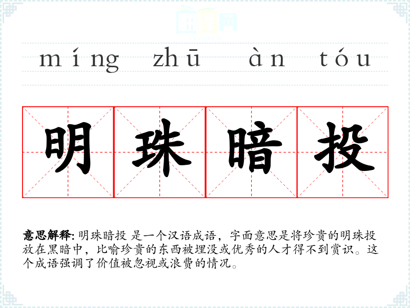 明珠暗投 是一个汉语成语,字面意思是将珍贵的明珠投放在黑暗中,比喻珍贵的东西被埋没或优秀的人才得不到赏识。这个成语强调了价值被忽视或浪费的情况。