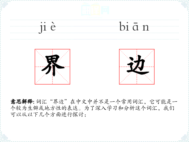 词汇“界边”在中文中并不是一个常用词汇,它可能是一个较为生僻或地方性的表达。为了深入学习和分析这个词汇,我们可以从以下几个方面进行探讨: