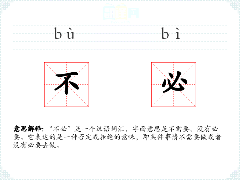 “不必”是一个汉语词汇,字面意思是不需要、没有必要。它表达的是一种否定或拒绝的意味,即某件事情不需要做或者没有必要去做。