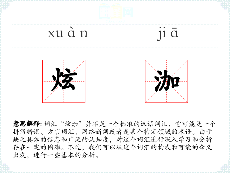 由于“炫泇”不是一个标准词汇,我们无法给出确切的字面意思和基本含义。如果将其拆分为“炫”和“泇”两个部分,我们可以分别解释: