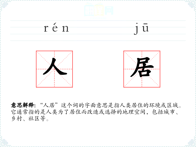 “人居”这个词的字面意思是指人类居住的环境或区域。它通常指的是人类为了居住而改造或选择的地理空间,包括城市、乡村、社区等。