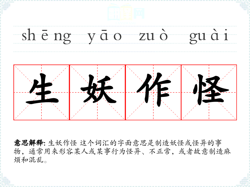 生妖作怪 这个词汇的字面意思是制造妖怪或怪异的事物,通常用来形容某人或某事行为怪异、不正常,或者故意制造麻烦和混乱。