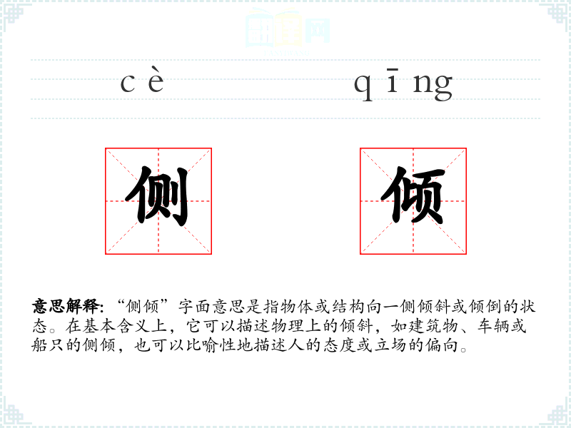 “侧倾”由“侧”和“倾”两个字组成。在古代汉语中,“侧”指旁边,“倾”指倾斜。随着语言的发展,“侧倾”逐渐被用来描述各种倾斜状态,并在现代汉语中广泛使用。