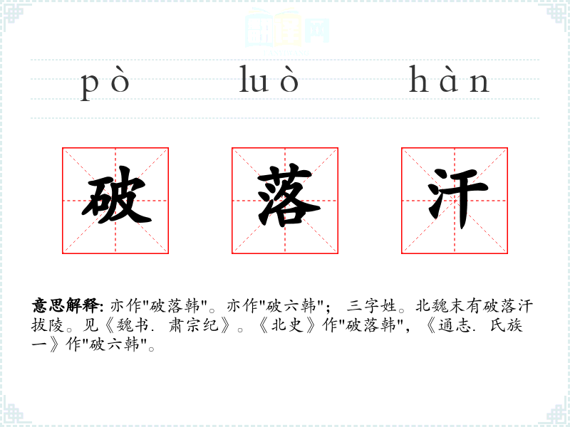 亦作"破落韩"。亦作"破六韩"; 三字姓。北魏末有破落汗拔陵。见《魏书.肃宗纪》。《北史》作"破落韩",《通志.氏族一》作"破六韩"。