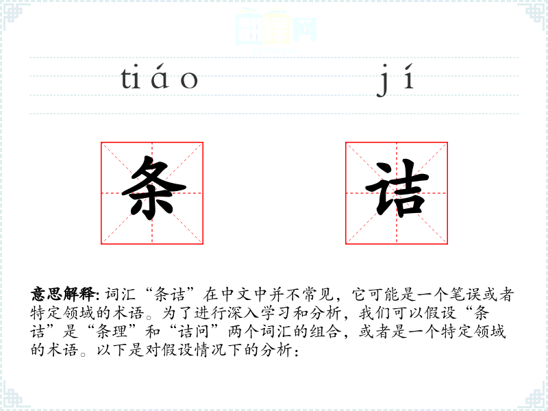 词汇“条诘”在中文中并不常见,它可能是一个笔误或者特定领域的术语。为了进行深入学*和分析,我们可以假设“条诘”是“条理”和“诘问”两个词汇的组合,或者是一个特定领域的术语。以下是对假设情况下的分析: