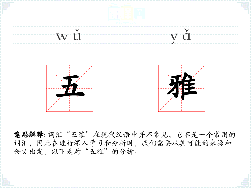 词汇“五雅”在现代汉语中并不常见,它不是一个常用的词汇,因此在进行深入学*和分析时,我们需要从其可能的来源和含义出发。以下是对“五雅”的分析: