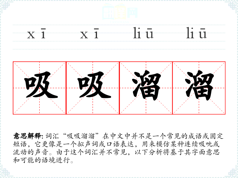 词汇“吸吸溜溜”在中文中并不是一个常见的成语或固定短语,它更像是一个拟声词或口语表达,用来模仿某种连续吸吮或流动的声音。由于这个词汇并不常见,以下分析将基于其字面意思和可能的语境进行。