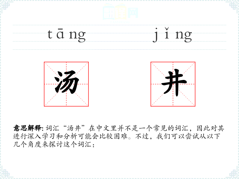 同义词:可能没有确切的同义词,因为“汤井”是一个非常特定的词汇。 反义词:同样,由于其特定性,可能没有直接的反义词。