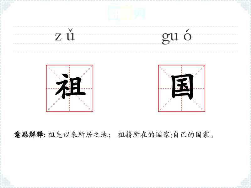 祖先以来所居之地; 祖籍所在的国家;自己的国家。