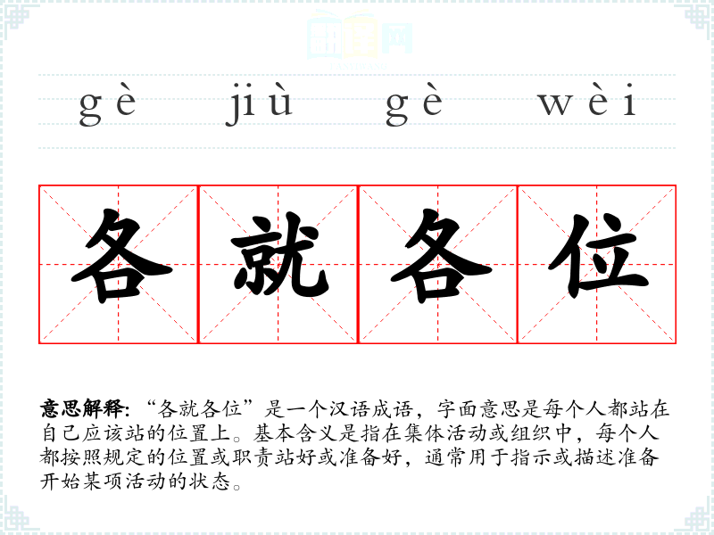“各就各位”是一个汉语成语,字面意思是每个人都站在自己应该站的位置上。基本含义是指在集体活动或组织中,每个人都按照规定的位置或职责站好或准备好,通常用于指示或描述准备开始某项活动的状态。