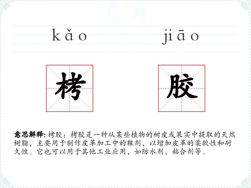 - 专业领域:在皮革制造和化工领域,栲胶是一个重要的专业术语,用于描述一种特定的材料和工艺。