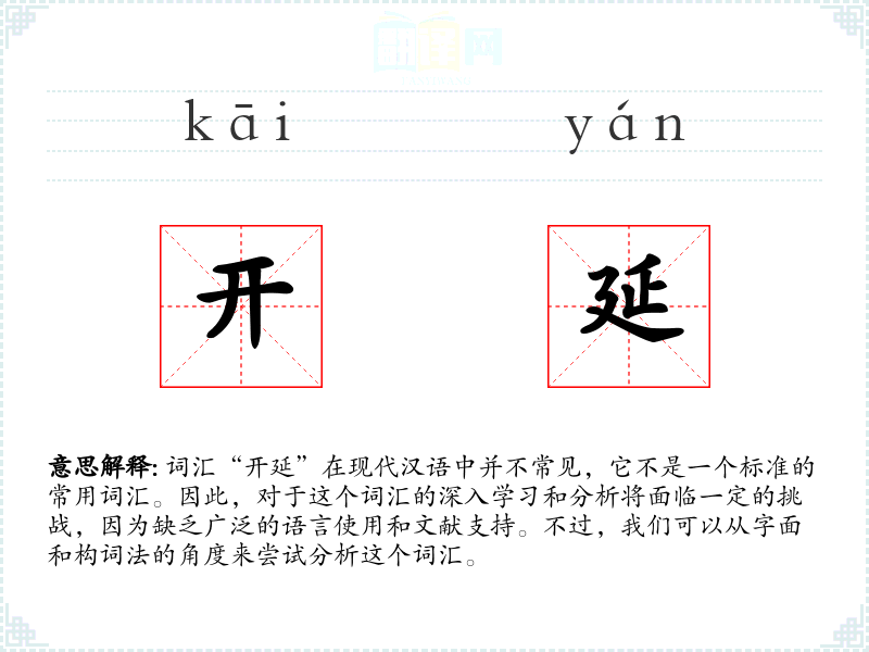 词汇“开延”在现代汉语中并不常见,它不是一个标准的常用词汇。因此,对于这个词汇的深入学*和分析将面临一定的挑战,因为缺乏广泛的语言使用和文献支持。不过,我们可以从字面和构词法的角度来尝试分析这个词汇。