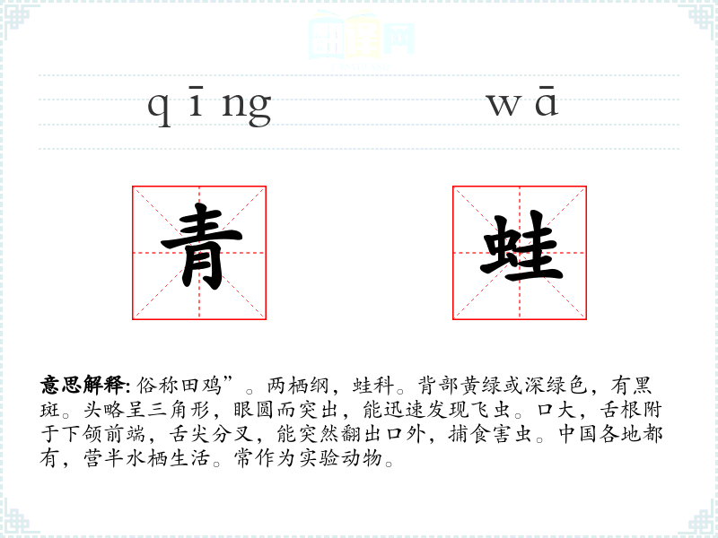 1.俗称田鸡”。两栖纲,蛙科。背部黄绿或深绿色,有黑斑。头略呈三角形,眼圆而突出,能迅速发现飞虫。口大,舌根附于下颌前端,舌尖分叉,能突然翻出口外,捕食害虫。中国各地都有,营半水栖生活。常作为实验动物。
