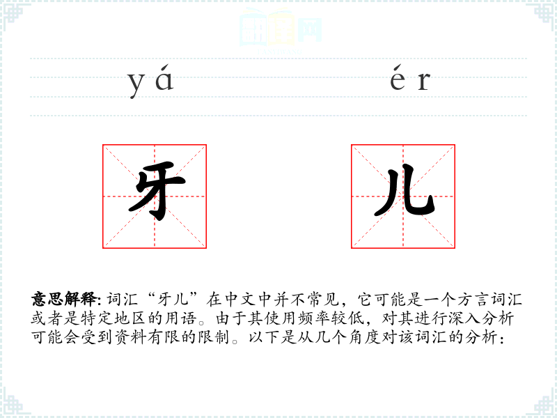 词汇“牙儿”在中文中并不常见,它可能是一个方言词汇或者是特定地区的用语。由于其使用频率较低,对其进行深入分析可能会受到资料有限的限制。以下是从几个角度对该词汇的分析: