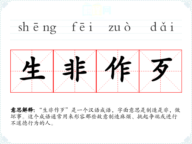 “生非作歹”是一个汉语成语,字面意思是制造是非,做坏事。这个成语通常用来形容那些故意制造麻烦、挑起争端或进行不道德行为的人。