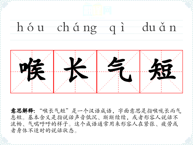 “喉长气短”是一个汉语成语,字面意思是指喉咙长而气息短。基本含义是指说话声音低沉、断断续续,或者形容人说话不流畅、气喘吁吁的样子。这个成语通常用来形容人在紧张、疲劳或者身体不适时的说话状态。