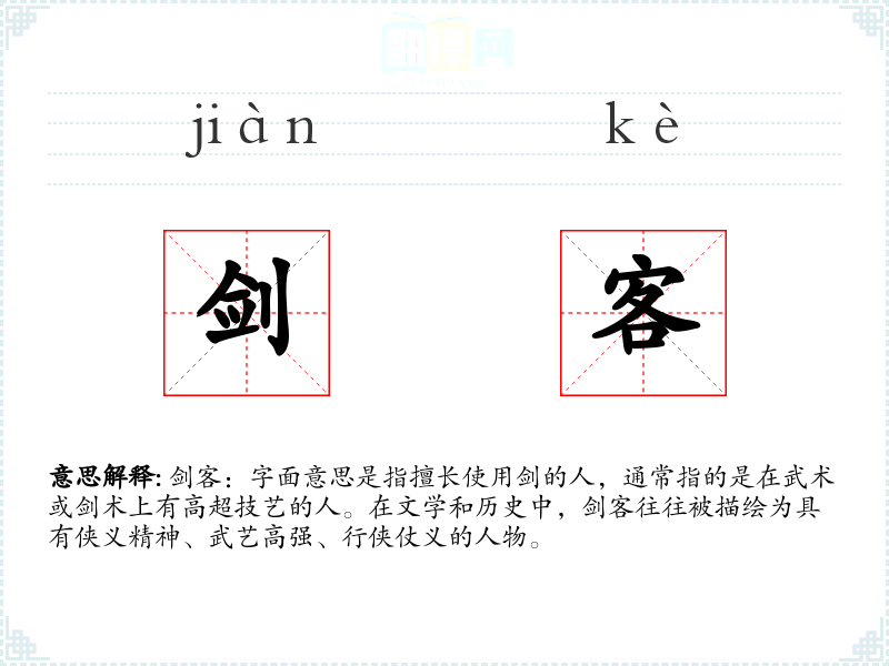 剑客:字面意思是指擅长使用剑的人,通常指的是在武术或剑术上有高超技艺的人。在文学和历史中,剑客往往被描绘为具有侠义精神、武艺高强、行侠仗义的人物。