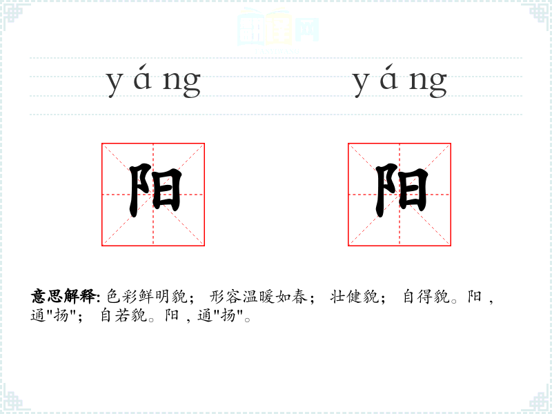 色彩鲜明貌; 形容温暖如春; 壮健貌; 自得貌。阳﹐通"扬"; 自若貌。阳﹐通"扬"。