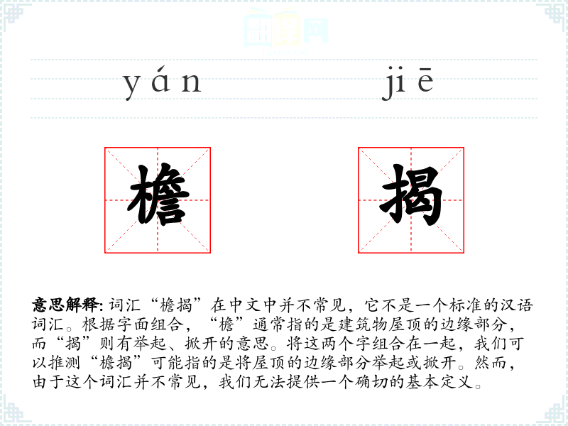 词汇“檐揭”在中文中并不常见,它不是一个标准的汉语词汇。根据字面组合,“檐”通常指的是建筑物屋顶的边缘部分,而“揭”则有举起、掀开的意思。将这两个字组合在一起,我们可以推测“檐揭”可能指的是将屋顶的边缘部分举起或掀开。然而,由于这个词汇并不常见,我们无法提供一个确切的基本定义。
