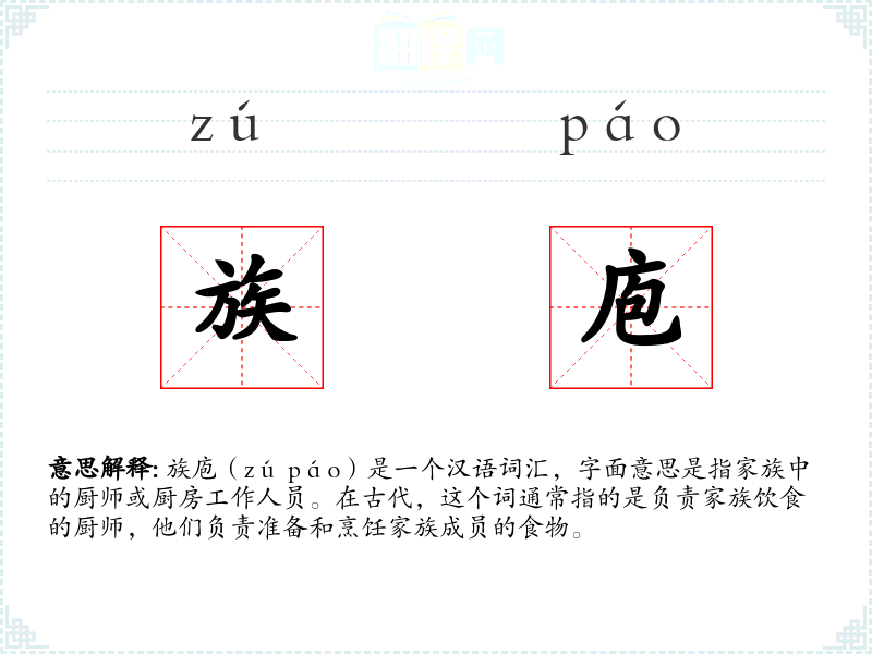族庖(zú páo)是一个汉语词汇,字面意思是指家族中的厨师或厨房工作人员。在古代,这个词通常指的是负责家族饮食的厨师,他们负责准备和烹饪家族成员的食物。