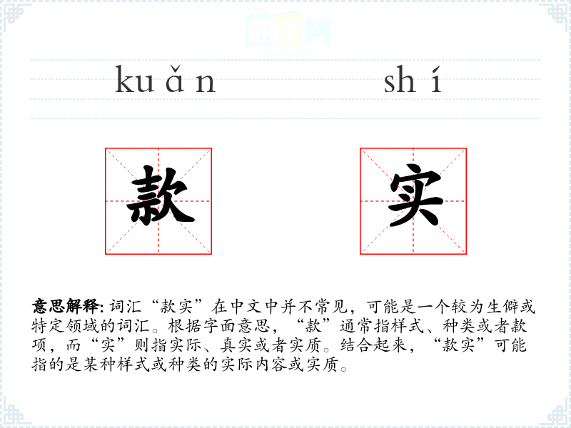 词汇“款实”在中文中并不常见,可能是一个较为生僻或特定领域的词汇。根据字面意思,“款”通常指样式、种类或者款项,而“实”则指实际、真实或者实质。结合起来,“款实”可能指的是某种样式或种类的实际内容或实质。