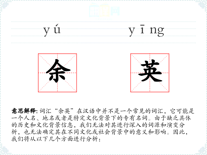 由于“余英”不是一个常见词汇,我们对其的理解和分析受到限制。在语言学习和表达中,了解常见词汇的基本定义、语境使用和词源演变是非常重要的,但对于不常见的词汇,我们需要更多的背景信息和语境支持来进行深入分析。