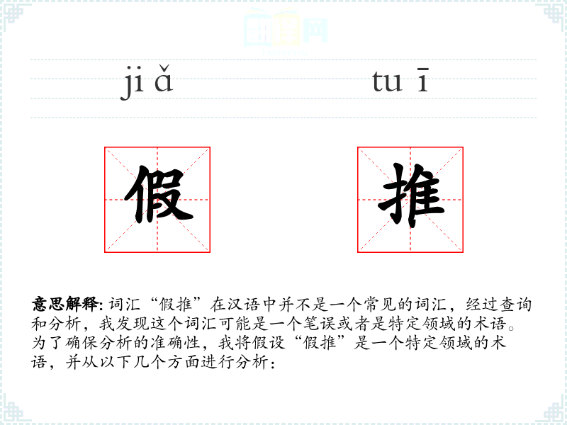 词汇“假推”在汉语中并不是一个常见的词汇,经过查询和分析,我发现这个词汇可能是一个笔误或者是特定领域的术语。为了确保分析的准确性,我将假设“假推”是一个特定领域的术语,并从以下几个方面进行分析:
