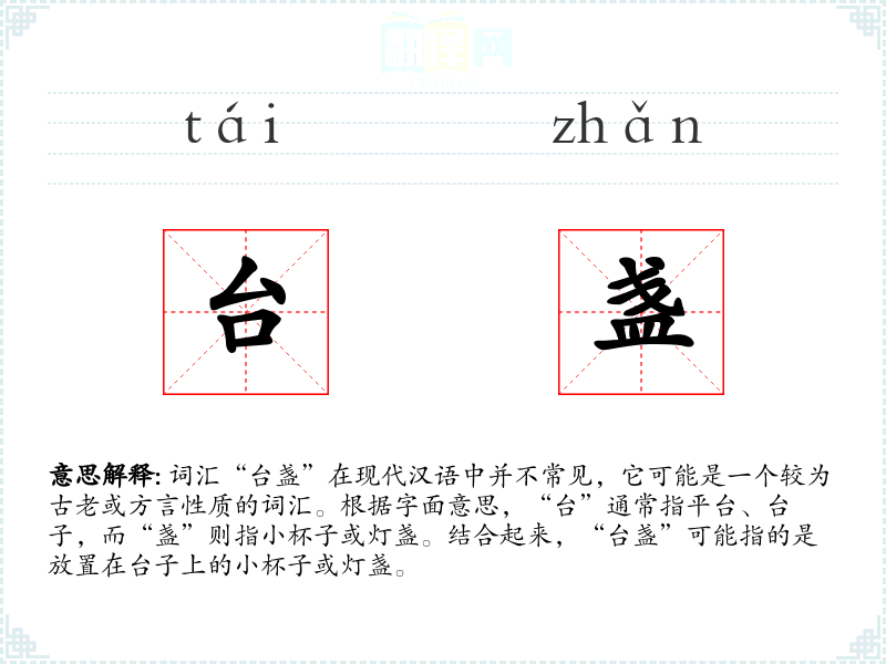 - 理解:“台盏”是一个具有历史文化底蕴的词汇,虽然在现代汉语中不常见,但在描述古代文人生活或古董收藏时,仍具有独特的表达效果。
