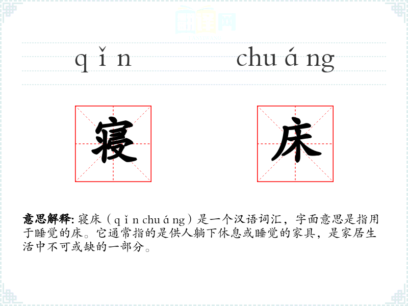 寝床(qǐn chuáng)是一个汉语词汇,字面意思是指用于睡觉的床。它通常指的是供人躺下休息或睡觉的家具,是家居生活中不可或缺的一部分。