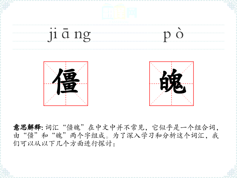 词汇“僵魄”在中文中并不常见,它似乎是一个组合词,由“僵”和“魄”两个字组成。为了深入学*和分析这个词汇,我们可以从以下几个方面进行探讨: