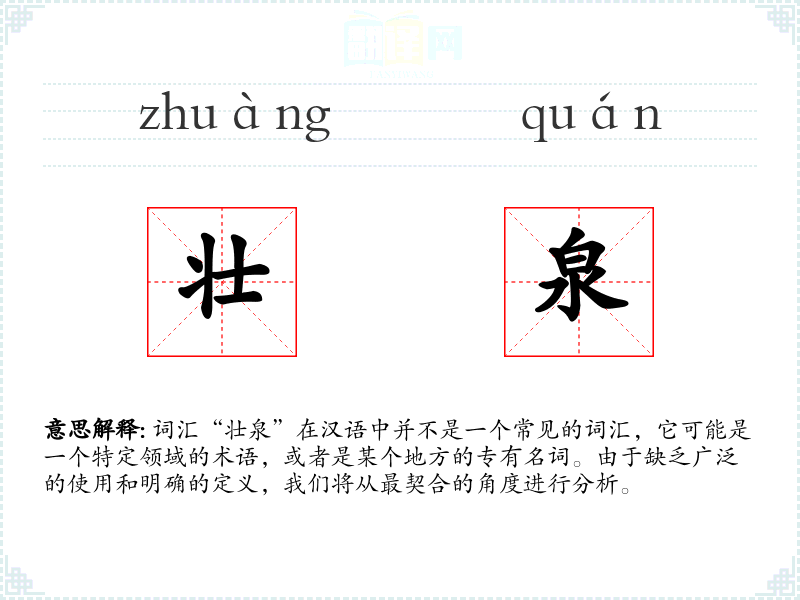 词汇“壮泉”在汉语中并不是一个常见的词汇,它可能是一个特定领域的术语,或者是某个地方的专有名词。由于缺乏广泛的使用和明确的定义,我们将从最契合的角度进行分析。
