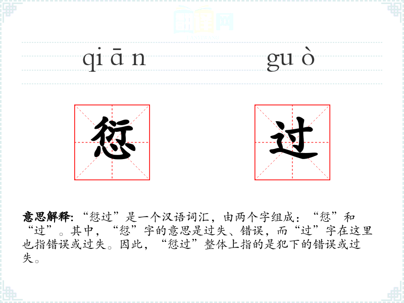 “愆”字最早见于《说文解字》,原意为错过、失去。随着时间的推移,其意义逐渐扩展到指代道德或行为上的过失。“过”字则是一个更常见的字,基本意义为超过或错误。两个字组合后,“愆过”强调了过失的严重性和后果。