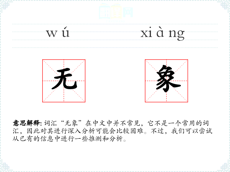 “无象”字面意思是指没有形象或形态。在汉语中,“无”表示没有,“象”通常指形象或形态。因此,“无象”可以理解为没有具体形象或形态的状态。