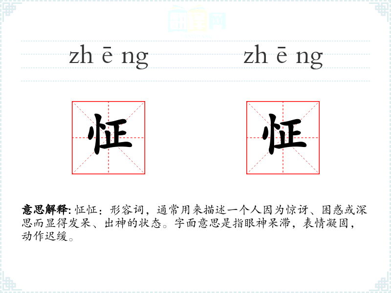 怔怔:形容词,通常用来描述一个人因为惊讶、困惑或深思而显得发呆、出神的状态。字面意思是指眼神呆滞,表情凝固,动作迟缓。