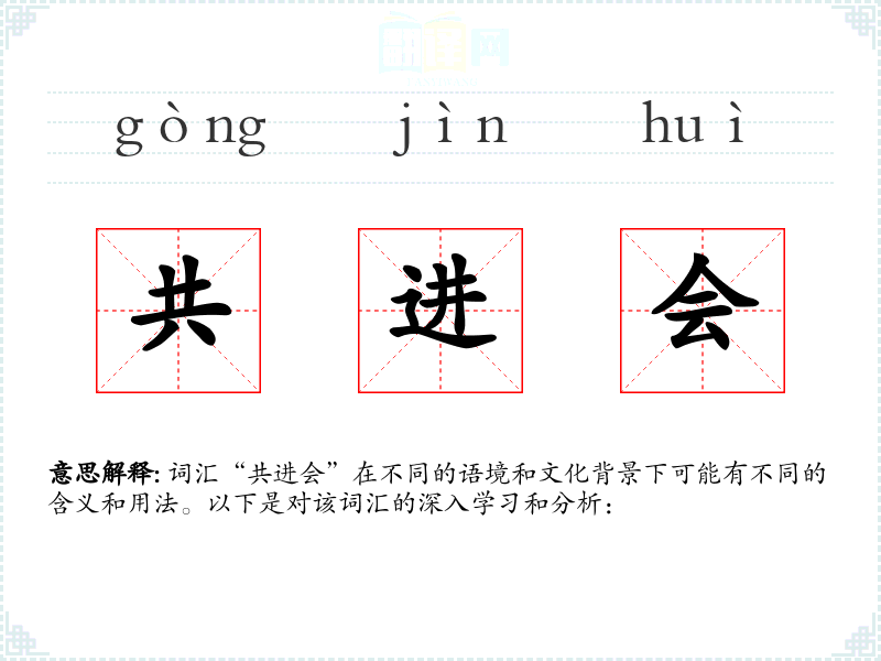 - 口语:在日常口语中,“共进会”可能被用来指代任何形式的集体活动或聚会,如学*小组、工作坊等。