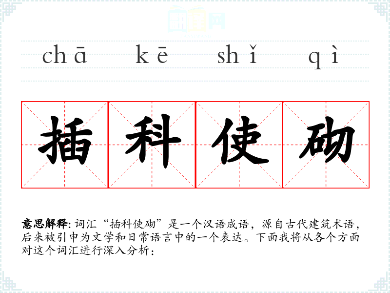 词汇“插科使砌”是一个汉语成语,源自古代建筑术语,后来被引申为文学和日常语言中的一个表达。下面我将从各个方面对这个词汇进行深入分析: