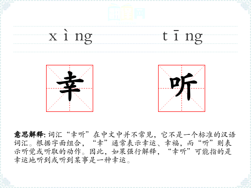 词汇“幸听”在中文中并不常见,它不是一个标准的汉语词汇。根据字面组合,“幸”通常表示幸运、幸福,而“听”则表示听觉或听取的动作。因此,如果强行解释,“幸听”可能指的是幸运地听到或听到某事是一种幸运。