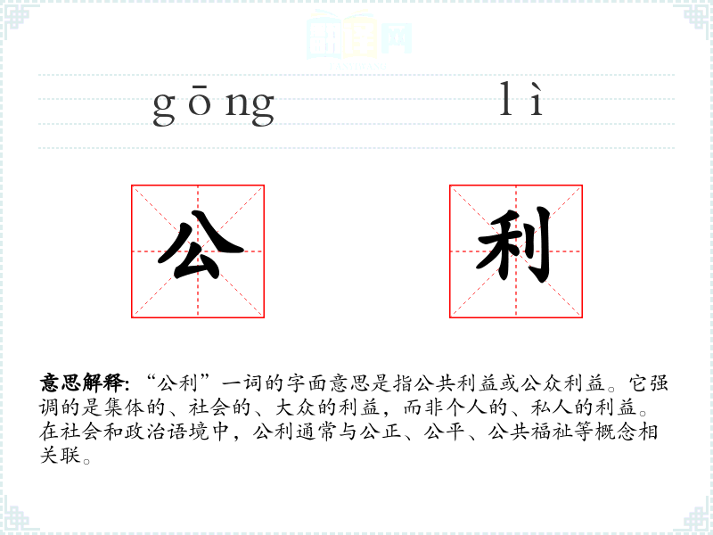 “公利”一词的字面意思是指公共利益或公众利益。它强调的是集体的、社会的、大众的利益,而非个人的、私人的利益。在社会和政治语境中,公利通常与公正、公平、公共福祉等概念相关联。