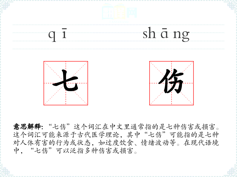“七伤”这个词汇在中文里通常指的是七种伤害或损害。这个词汇可能来源于古代医学理论,其中“七伤”可能指的是七种对人体有害的行为或状态,如过度饮食、情绪波动等。在现代语境中,“七伤”可以泛指多种伤害或损害。