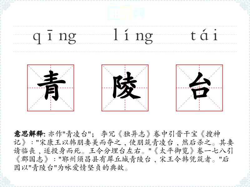1.亦作"青凌台"; 李冗《独异志》卷中引晋干宝《搜神记》﹕"宋康王以韩朋妻美而夺之﹐使朋筑青凌台﹐然后杀之。其妻请临丧﹐遂投身而死。王令分埋台左右。"《太平御览》卷一七八引《郡国志》﹕"郓州须昌县有犀丘城青陵台﹐宋王令韩凭筑者。"后因以"青陵台"为咏爱情坚贞的典故。