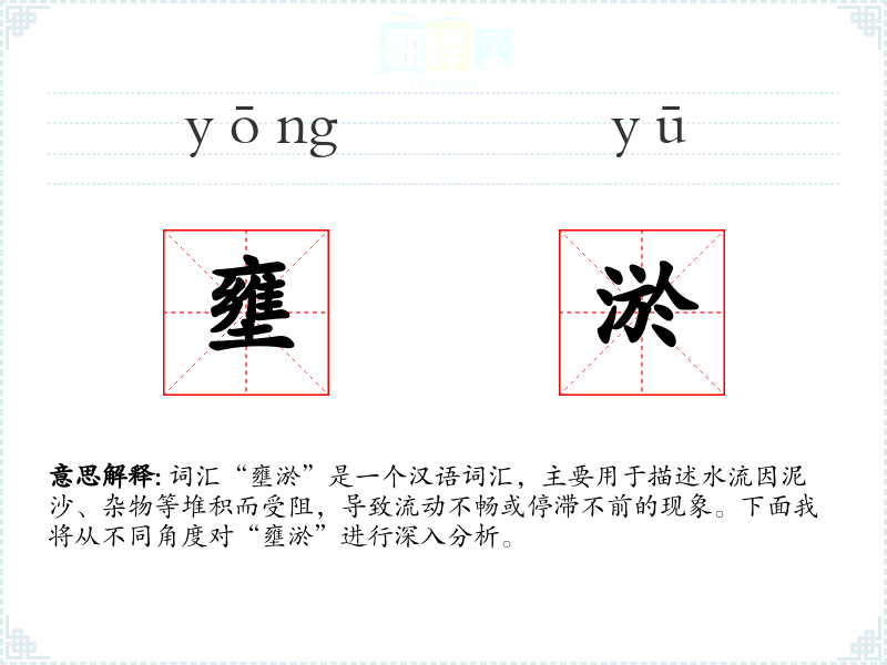 词汇“壅淤”是一个汉语词汇,主要用于描述水流因泥沙、杂物等堆积而受阻,导致流动不畅或停滞不前的现象。下面我将从不同角度对“壅淤”进行深入分析。