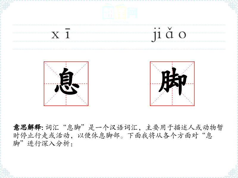 “息脚”字面意思是指停止行走或活动,以便让脚部得到休息。这个词汇通常用于描述人或动物在长时间行走或工作后,需要暂时停下来休息脚部的情况。