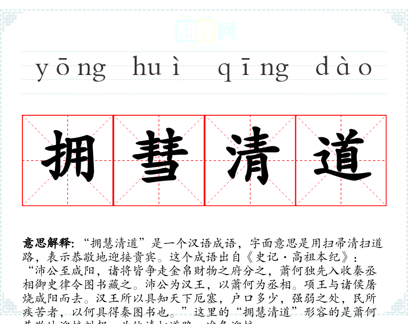“拥慧清道”源自古代的礼仪行为,特别是在迎接重要人物时的一种仪式。随着时间的推移,这个成语的含义逐渐固定,成为表示尊敬和欢迎的固定表达。
