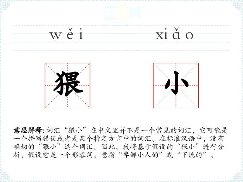 词汇“猥小”在中文里并不是一个常见的词汇,它可能是一个拼写错误或者是某个特定方言中的词汇。在标准汉语中,没有确切的“猥小”这个词汇。因此,我将基于假设的“猥小”进行分析,假设它是一个形容词,意指“卑鄙小人的”或“下流的”。