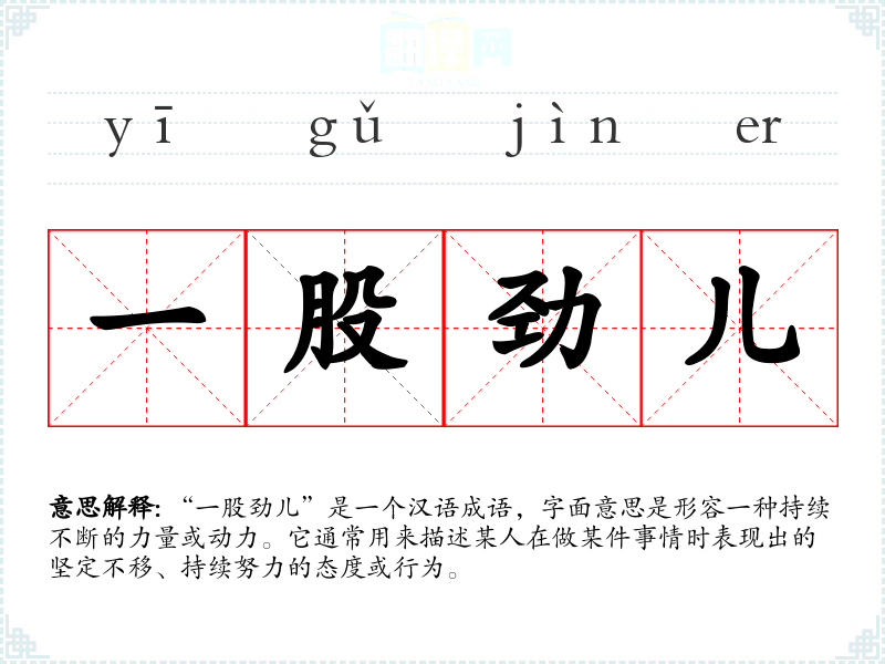 “一股劲儿”是一个汉语成语,字面意思是形容一种持续不断的力量或动力。它通常用来描述某人在做某件事情时表现出的坚定不移、持续努力的态度或行为。