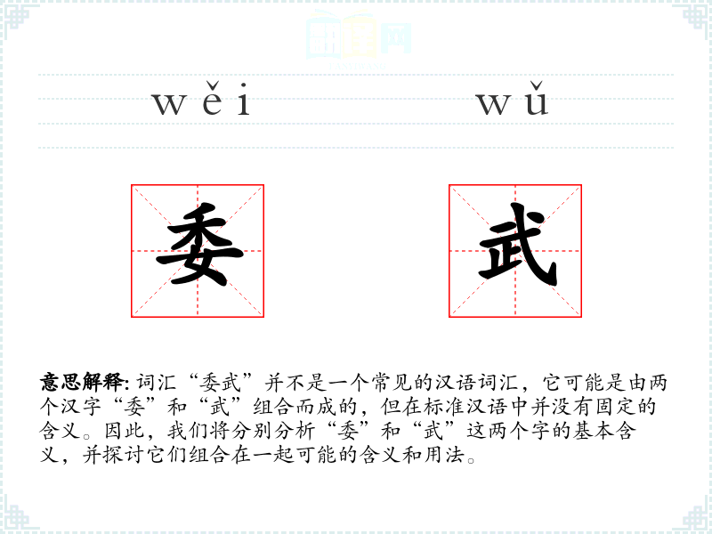 词汇“委武”并不是一个常见的汉语词汇,它可能是由两个汉字“委”和“武”组合而成的,但在标准汉语中并没有固定的含义。因此,我们将分别分析“委”和“武”这两个字的基本含义,并探讨它们组合在一起可能的含义和用法。
