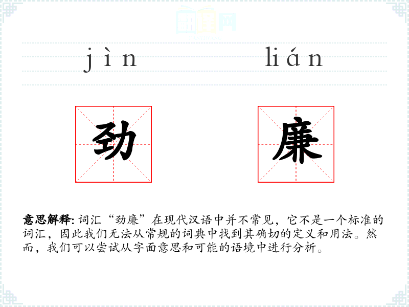 词汇“劲廉”在现代汉语中并不常见,它不是一个标准的词汇,因此我们无法从常规的词典中找到其确切的定义和用法。然而,我们可以尝试从字面意思和可能的语境中进行分析。