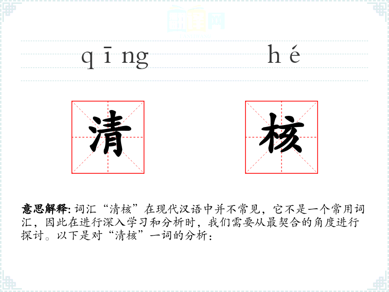 词汇“清核”在现代汉语中并不常见,它不是一个常用词汇,因此在进行深入学习和分析时,我们需要从最契合的角度进行探讨。以下是对“清核”一词的分析: