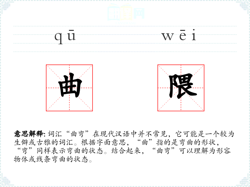 词汇“曲弯”在现代汉语中并不常见,它可能是一个较为生僻或古雅的词汇。根据字面意思,“曲”指的是弯曲的形状,“弯”同样表示弯曲的状态。结合起来,“曲弯”可以理解为形容物体或线条弯曲的状态。